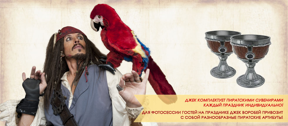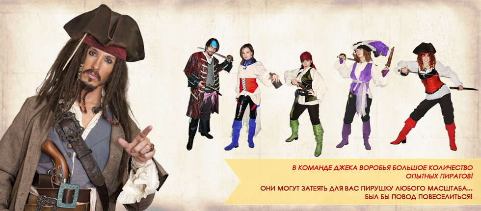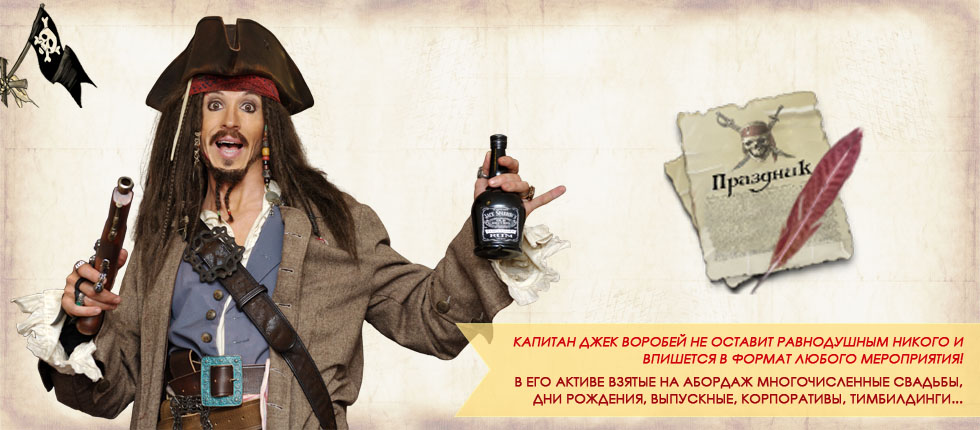 Украшенный многочисленным арсеналом конкурсов и сюрпризов Джека, Ваш праздник станет настоящим сокровищем и оставит в памяти яркие моменты захватывающих приключений.
